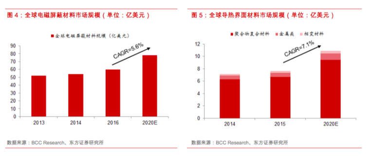 近年来随着软硬件技术不断升级,消费电子产品创新及通信设备升级推动电磁屏蔽和导热材料市场稳步增长。根据BCC Research的预测,全球EMI/RFI屏蔽材料市场规模将从2016年的60亿美元提高到2021年的78亿美元,复合增长率近6%,而全球界面导热材料的市场规模将从2015年的7.6亿美元提高到2020年的11亿美元,复合增长率超7%。