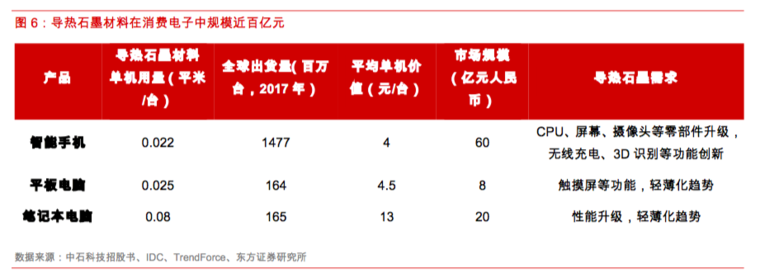 而属于新兴行业的石墨散热材料,自2011年开始大规模应用于消费电子产品中以来,近年呈现快速发展趋势,按照150-200元/平米的单价来计算,当前高导热石墨材料在消费电子领域的市场规模达近百亿元人民币。