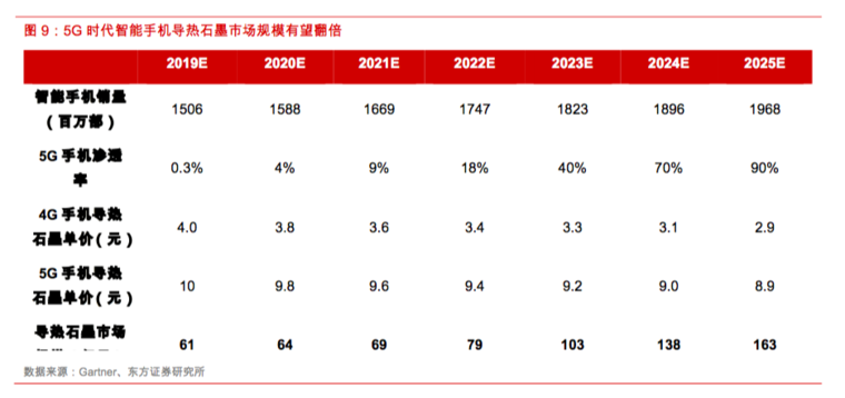以导热石墨为例,5G手机有望在更多关键零部件部位采用定制化导热石墨方案,同时复合型和多层高导热膜由于具备更优的散热效果而有望被更多采用,从而带来导热石墨单机价值的显著提升。假设未来5G手机中的导热石墨单价是4G手机中的2.5倍,伴随5G手机渗透率的提升,应用于智能手机的导热石墨市场规模将有望实现翻倍以上增长。