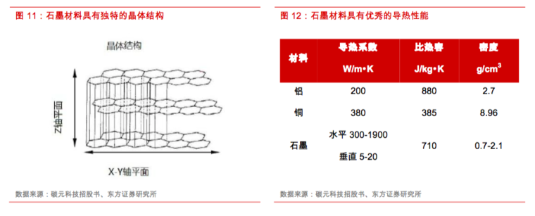 高导热石墨膜的石墨材料因其碳原子结构具有独特的晶粒取向,具备非常优异的平面导热性能,大大高于一般纯铜的导热系数,其片层状结构可很好地适应任何表面,同时具有密度低(轻量化)、高比热容(耐高温)、长期可靠等优点,成为散热解决方案的优秀材料。因此近年来高导热石墨膜在智能手机、超薄笔记本电脑、平板电脑和LED电视等消费电子产品领域均有广泛应用。