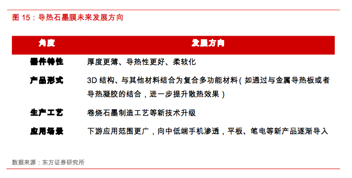 随着5G时代临近,电子产品对热管理方案有着更高的要求,因此对导热石墨膜材料将提出更多新的要求,围绕导热器件特性、产品形式、生产工艺、应用领域拓展等方面均有更高的要求,具备材料生产工艺升级与应用领域创新并重的发展趋势。