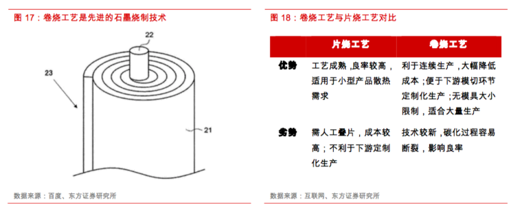 从生产工艺角度来看,导热石墨膜主要在基材处理的基础上,通过高温碳化、石墨化等环节加工而成,而高温烧制的工艺可分为片状烧制和卷式烧制技术。片烧石墨是将聚酰亚胺膜(PI膜)裁剪好后以间隔叠片的方式放入模具中,对其施压、碳化并石墨化的过程。而卷烧石墨是近年来的新兴技术,将PI膜卷绕于卷筒上,进行碳化热处理,再进行石墨化热处理,以形成卷筒状石墨膜的过程。相比于片烧工艺,卷烧石墨技术有着节省人工叠片流程的优点,且利于后续工艺的连续生产性,能大幅降低成本,同时成功的卷烧流程能使石墨膜具有良好的机械强度,没有模具大小的限制,因此十分适用于5G时代显著增长的散热需求,特别在大型设备(如基站)中具备广泛应用前景。