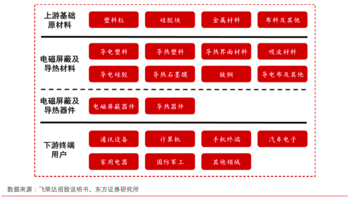电磁屏蔽和导热材料及器件处于产业链的中游,上游是塑料粒、硅胶块、金属材料和布料及其他等基础原材料,下游是通讯设备、计算机、手机终端、汽车电子、家用电器和国防军工等终端用户。其中,电磁屏蔽和导热器件是在电磁屏蔽和导热材料的基础上进行二次加工处理。