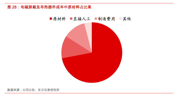同时,电磁屏蔽和导热材料生产环节毛利率一般高于器件加工环节,因此深耕材料环节的公司有望获得高于下游的毛利率水平,而同时具备材料生产与器件加工的公司毛利率水平也有望高于普通的器件加工厂商。