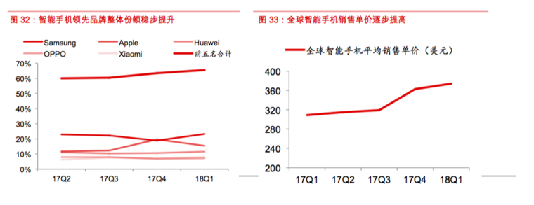 近年来,智能手机逐渐进入存量市场,市场份额持续朝向领先品牌厂商集中,国内“华米OV”四大厂商集中度提升趋势确定。在三星、苹果领先地位稳固、国产高端品牌崛起的趋势下,智能手机存量市场具有高端化升级的结构性变化,电磁屏蔽与导热产品有望更广泛地渗透到智能手机领域,与国内外领先客户关系良好的公司将充分受益于5G时代智能手机升级带来的增量需求。