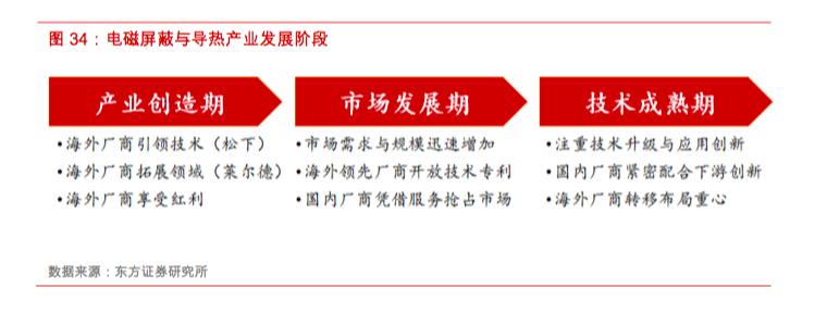 海外大型厂商在电磁屏蔽及导热领域发展初期引领技术创新,能够在第一时间享受创新导入带来的红利,进而伴随技术的逐渐成熟和市场规模的逐渐扩大,同时下游向大陆转移趋势明显,海外厂商追加扩产、研发等资本开支的动力不足,营收规模及市场份额很难保持持续增长,同时考虑到逐渐上升的成本压力,因此海外巨头不再重点布局消费电子电磁屏蔽与导热领域,并对技术专利呈现开放共享的态度,侧面推动了产业国产化转移的趋势。
