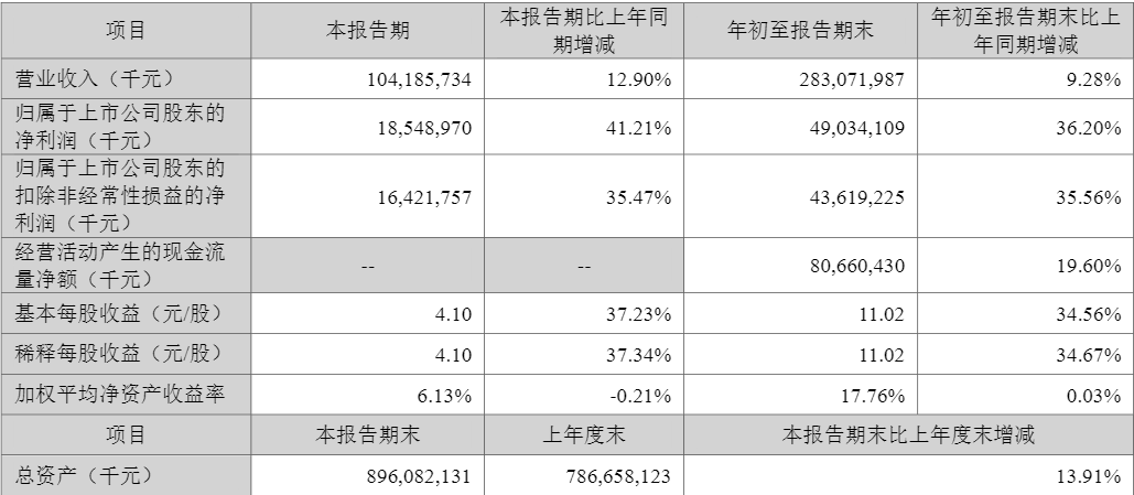 前三季度累计实现营业收入2830.72亿元,同比增长9.28%;归属于上市公司股东的净利润490.34亿元,同比增长36.20%。